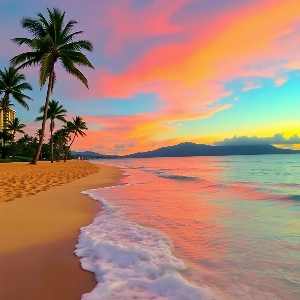 A stunning tropical beach at sunset featuring swaying palm trees, golden sand, and turquoise waters. The sky displays vibrant colors of pink, orange, and blue, with distant mountains creating a perfect paradise landscape. Gentle waves lap the pristine shore.