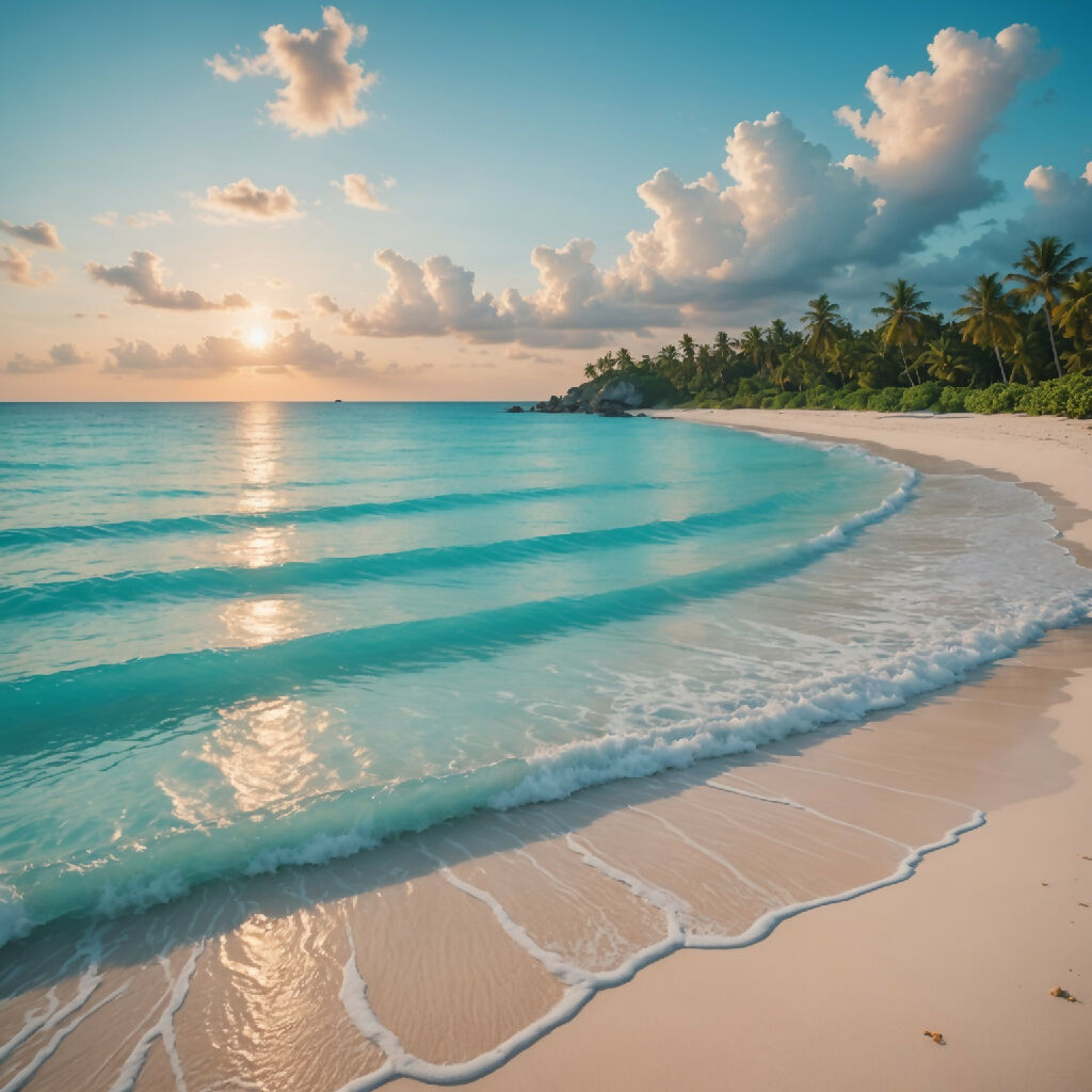 A stunning tropical beach scene at sunset, with turquoise waters and soft waves washing onto white sandy shores. Palm trees line the coast under a glowing sky, creating a peaceful and cinematic atmosphere of natural beauty and relaxation.