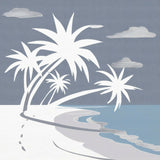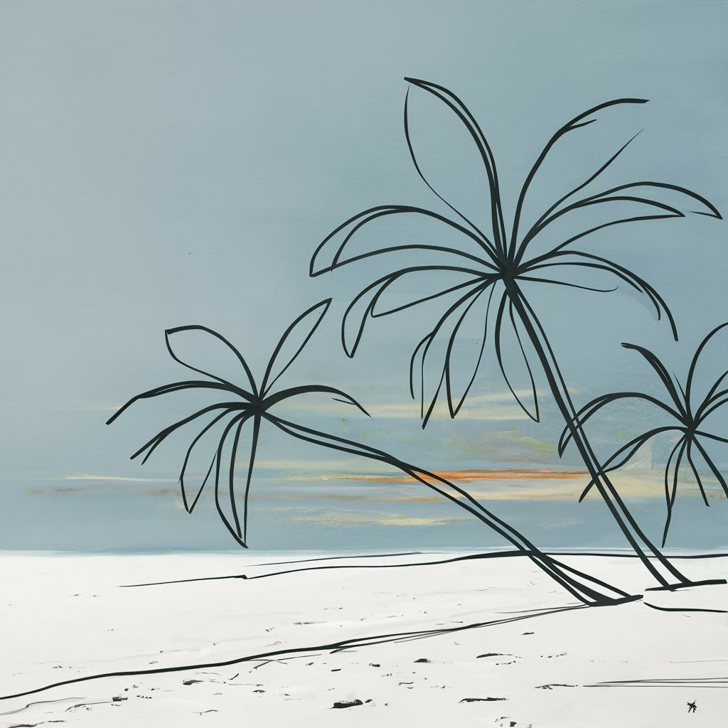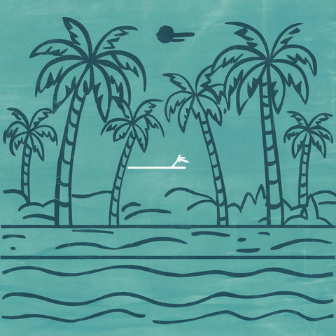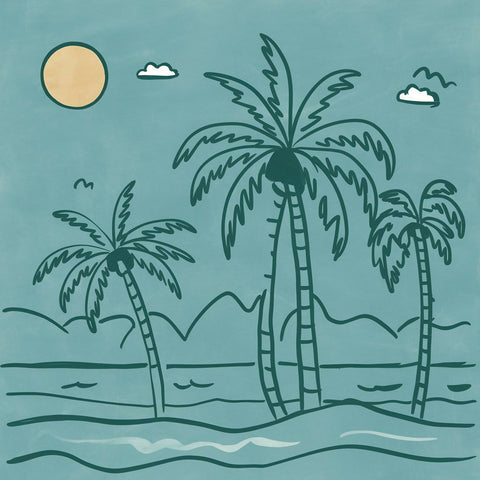 It uses simple, clean lines to depict the palm trees and beach with a limited color palette.