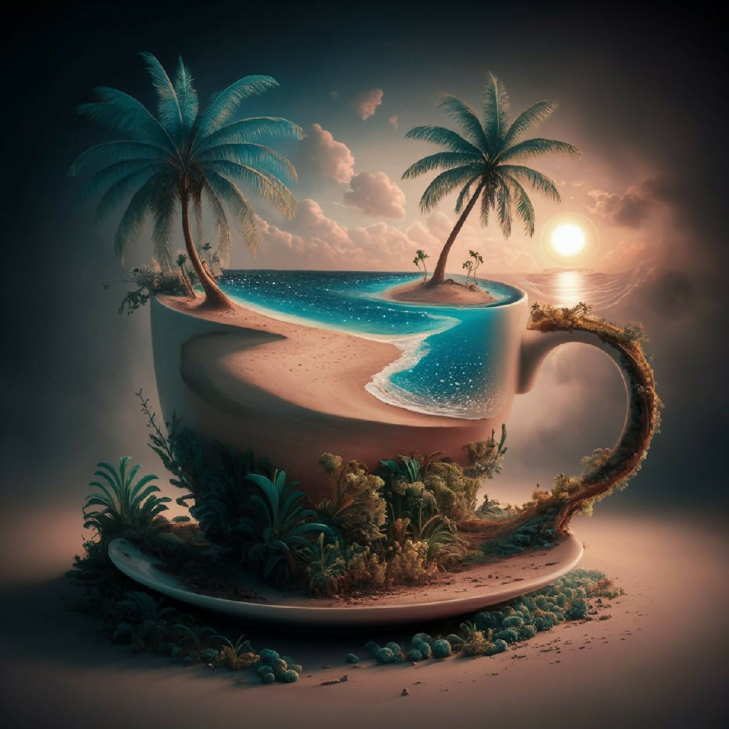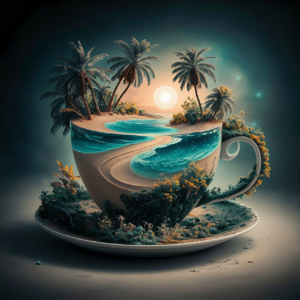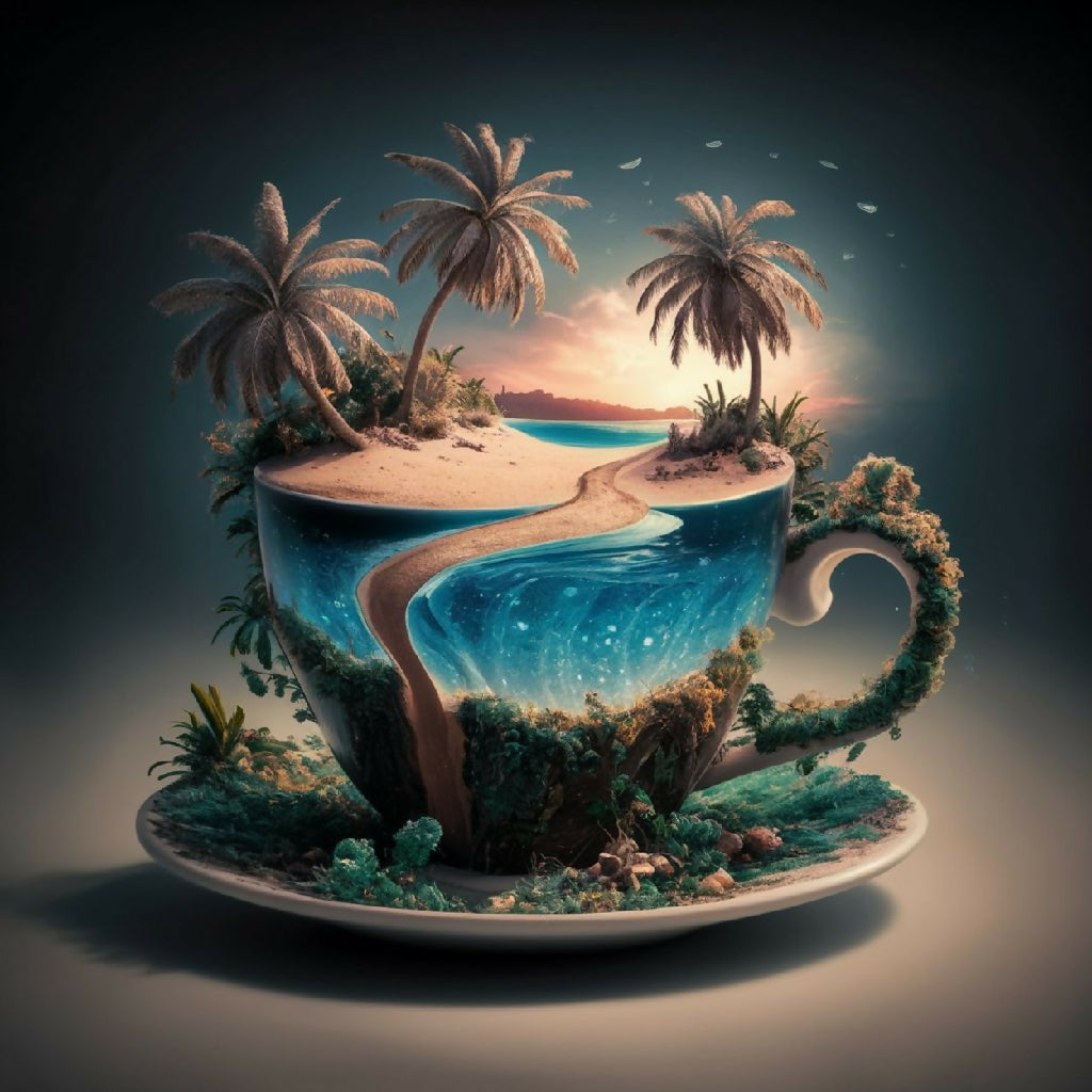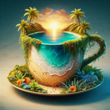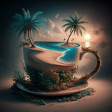 This surreal artwork depicts a miniature tropical paradise contained within a large, ornate cup. The scene features a serene beach with golden sand, gentle waves of turquoise water, and lush palm trees swaying under a vibrant sunset sky. The cup is adorned with natural elements like vines and greenery, blending seamlessly with the island landscape. The image evokes a sense of tranquility and imaginative escape, merging the everyday object of a cup with an idyllic, dreamlike natural setting.