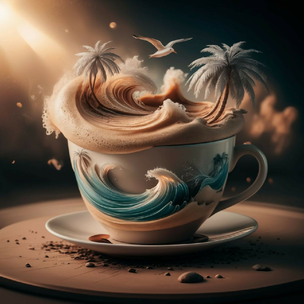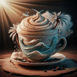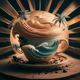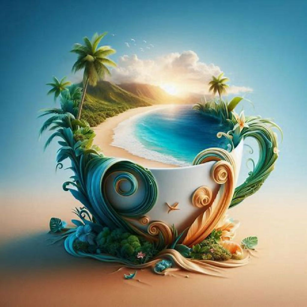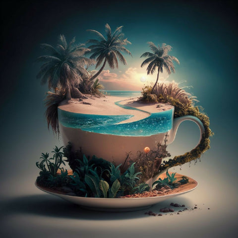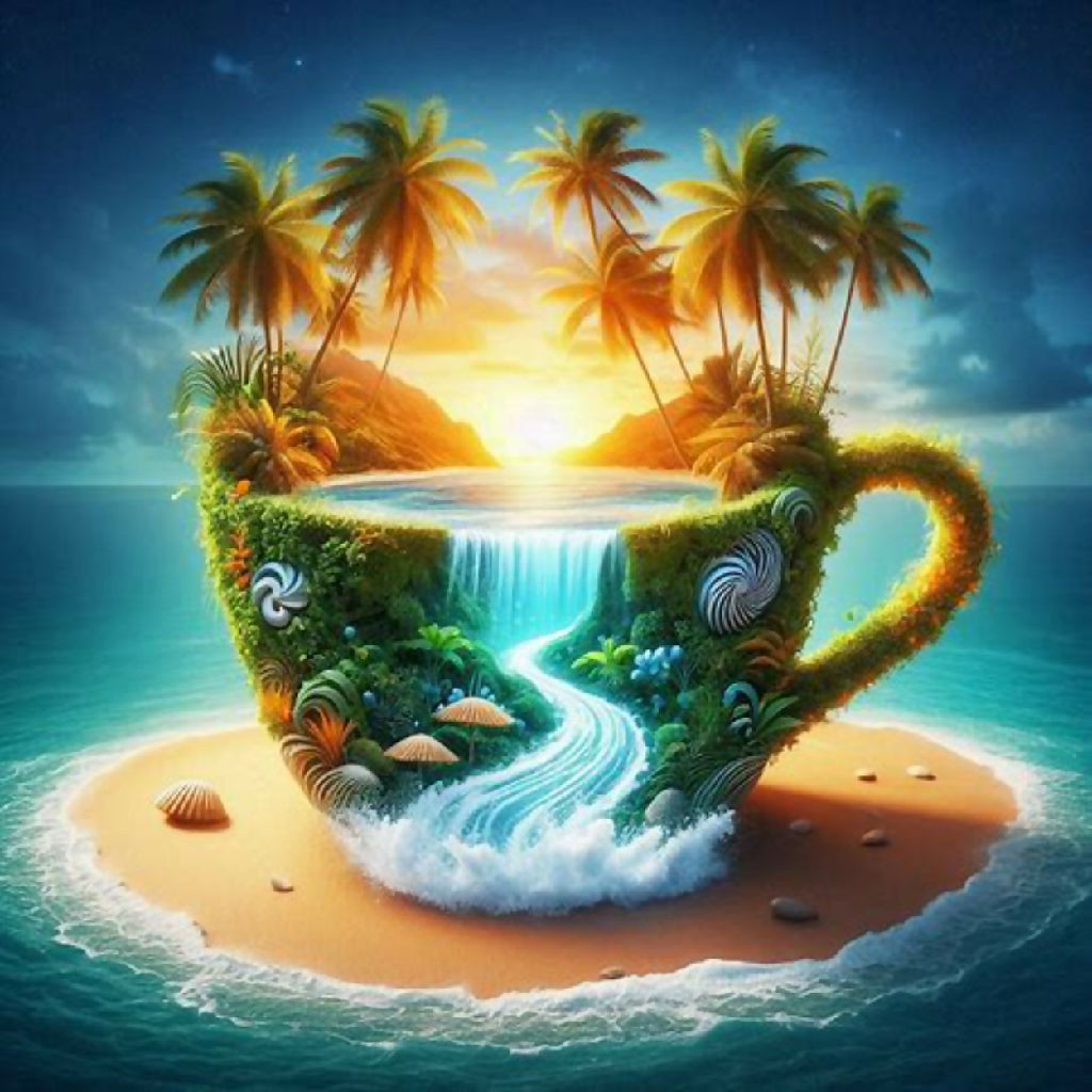 This surreal artwork depicts a miniature tropical paradise contained within a large, ornate cup. The scene features a serene beach with golden sand, gentle waves of turquoise water, and lush palm trees swaying under a vibrant sunset sky. The cup is adorned with natural elements like vines and greenery, blending seamlessly with the island landscape. The image evokes a sense of tranquility and imaginative escape, merging the everyday object of a cup with an idyllic, dreamlike natural setting.