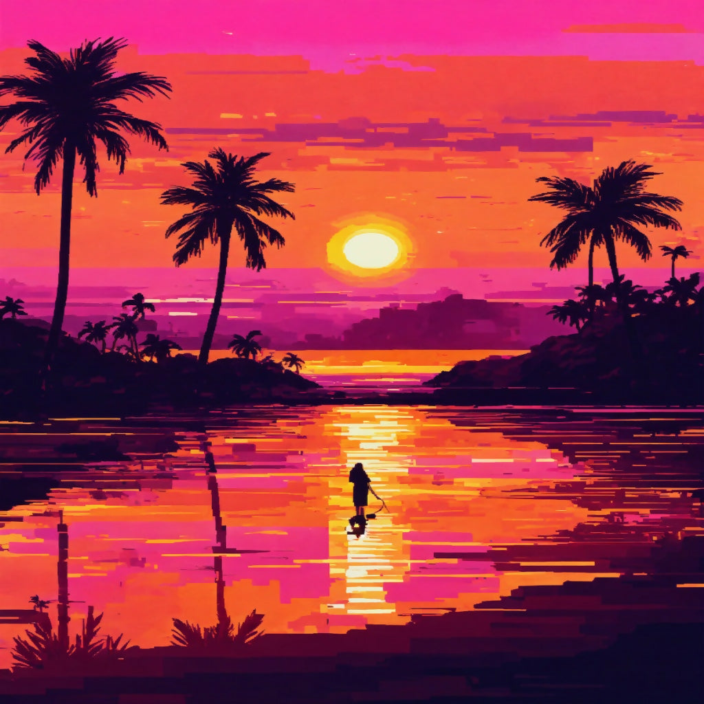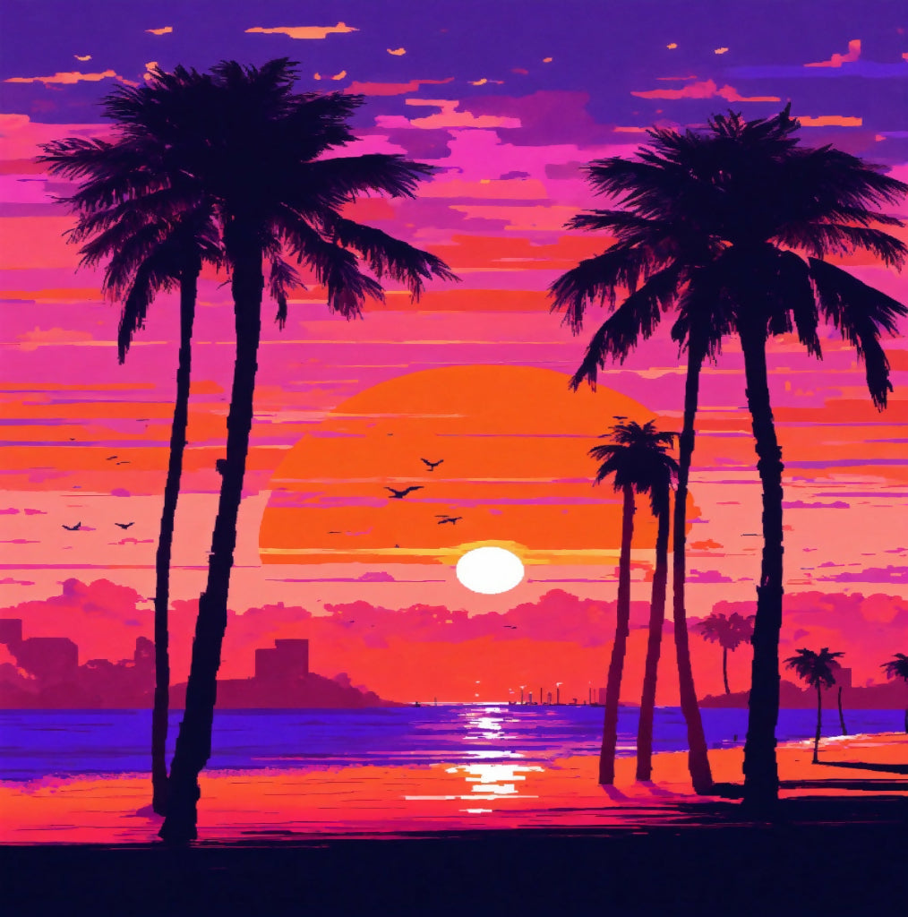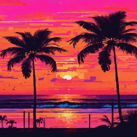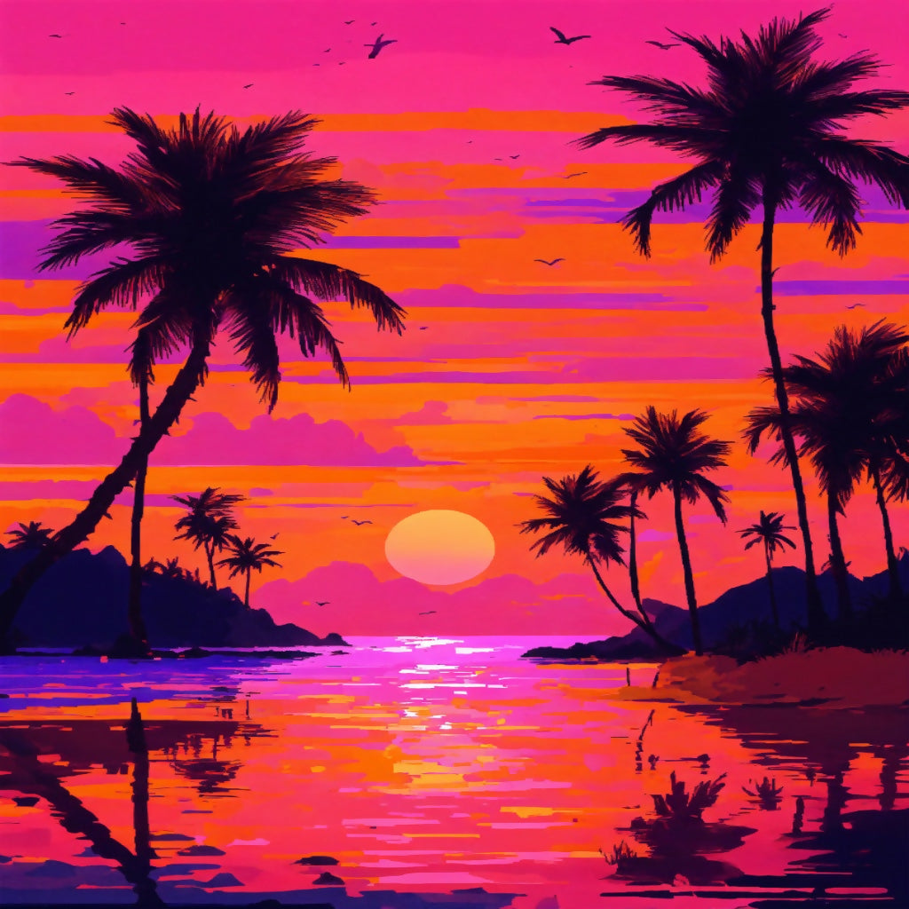 The image depicts a vibrant tropical sunset scene. The sky is filled with shades of pink, purple, and orange, transitioning to a darker hue at the top. A large sun sits low on the horizon, casting a reflection across calm waters. Silhouettes of palm trees are scattered throughout the foreground and on small land masses in the distance. Birds are flying in the sky above the water. The use of vivid colors and silhouettes gives this image an interesting contrast and evokes a sense of tranquility typical of a tropical paradise at dusk.