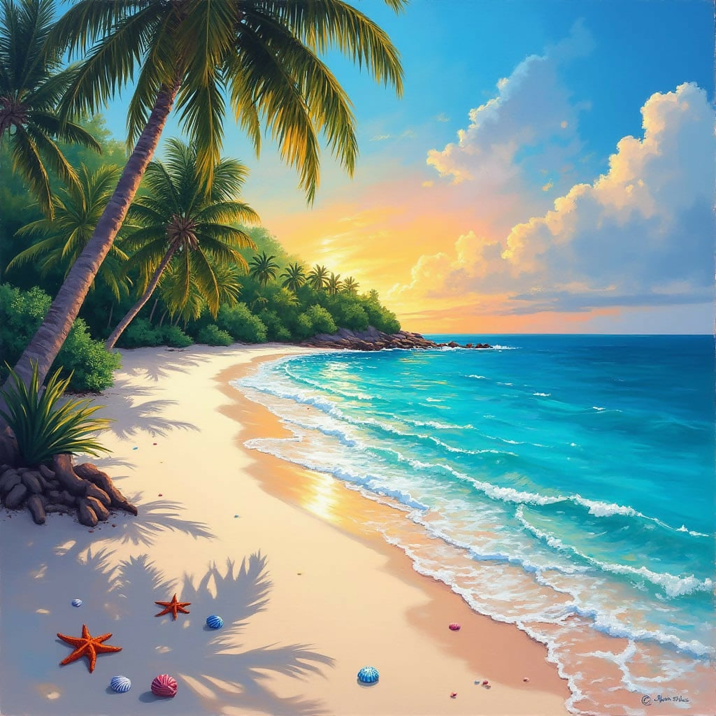 Tropical Tranquility captures a serene sunset over a pristine beach, where gentle waves meet golden sands, palm trees sway in the breeze, and nature rests in peaceful harmony.