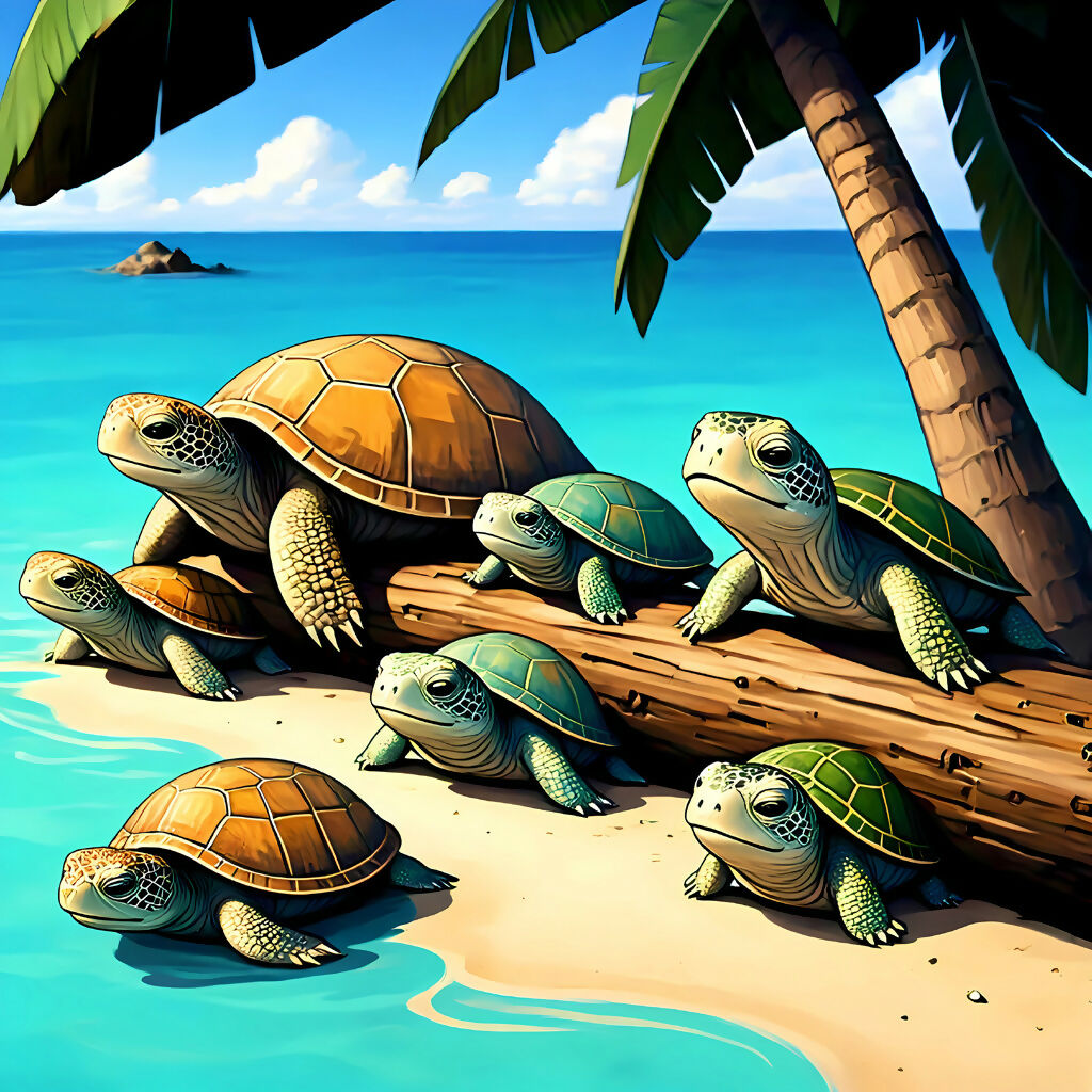 A tranquil moment unfolds on a sun-kissed tropical beach where eight sea turtles—young and old—gather beneath the shade of a palm tree. Some rest on driftwood, others nestle into the warm sand, all framed by a turquoise ocean and distant island. This AI-generated artwork celebrates the quiet wisdom and communal spirit of these ancient mariners. Inspired by the harmony of untouched coastal ecosystems, it invites viewers to pause, breathe, and reconnect with nature’s rhythm. Perfect for ocean lovers, conservation advocates, and anyone drawn to the peaceful beauty of marine life.
