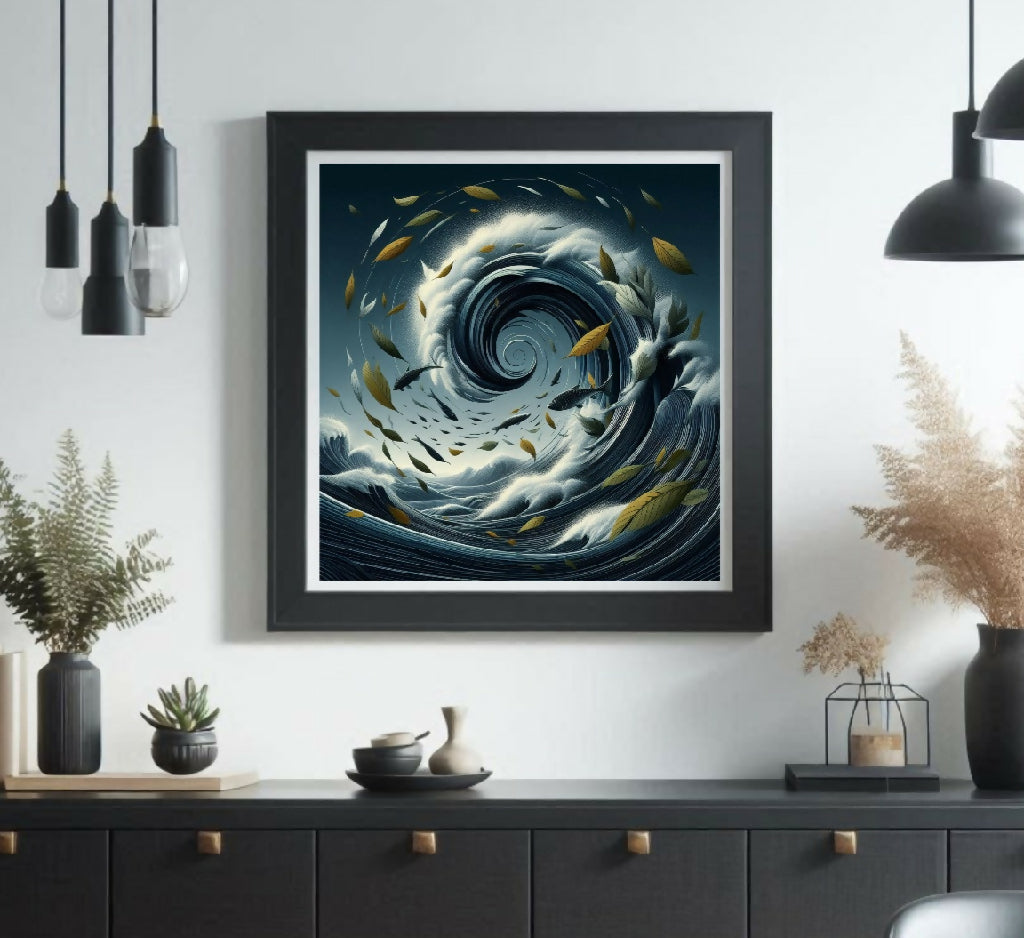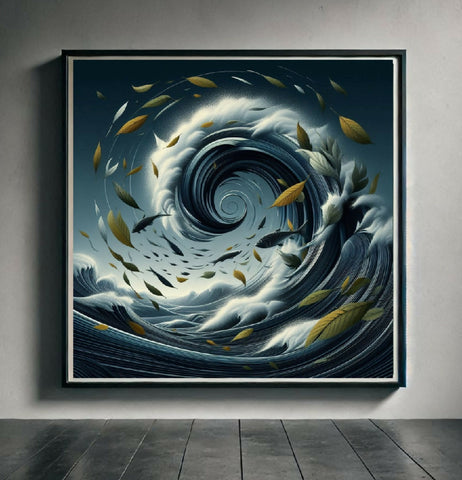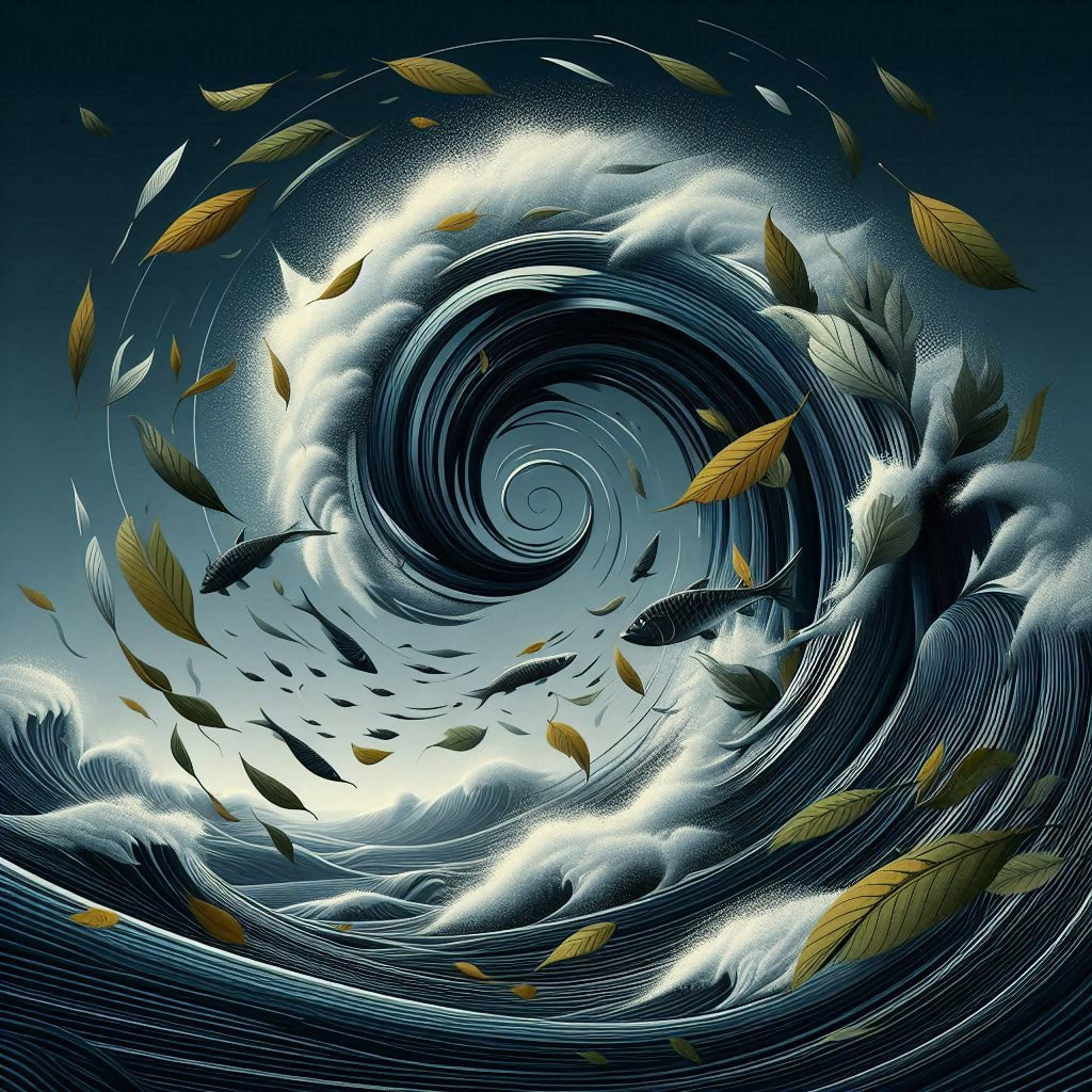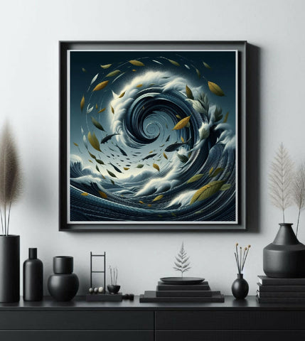 Eine Welle mit Fischen und Blättern. Die Farben sind überwiegend dunkelblau und goldbraun. Das Bild hat einen abstrakten und künstlerischen Charakter.
