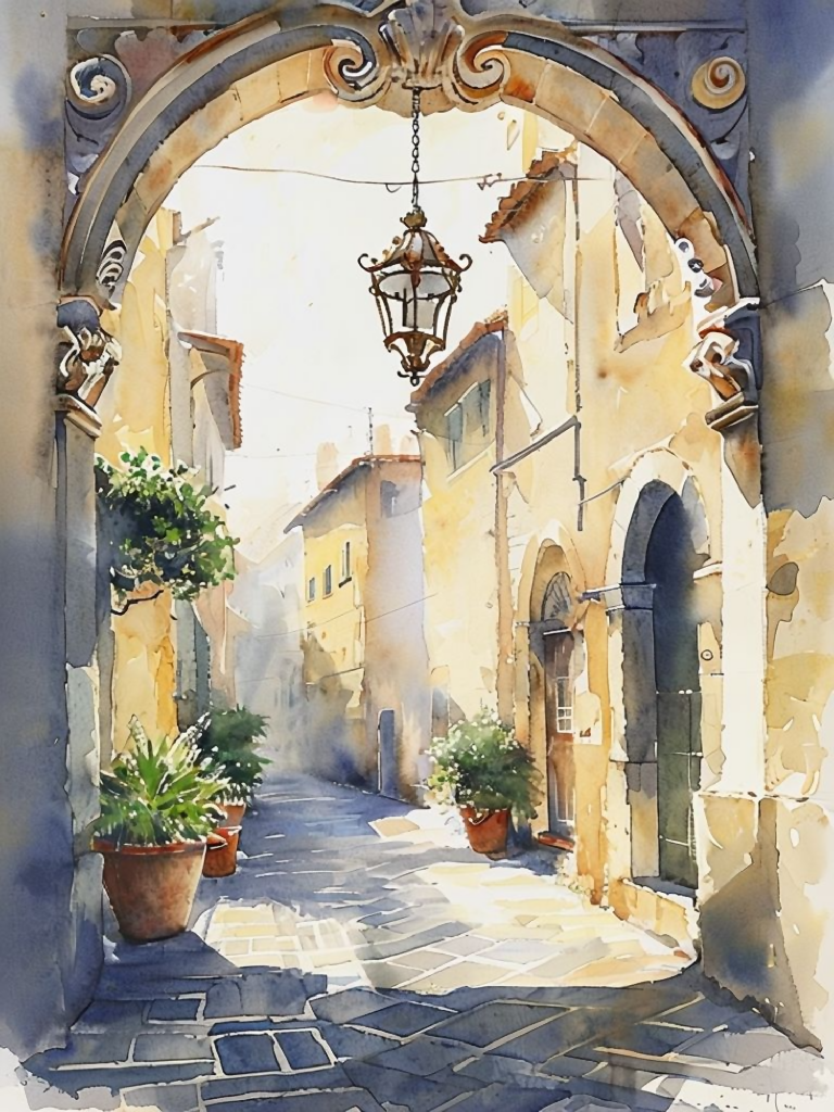 Tuscan Archway Street Scene Watercolor: Italian Village Digital Art Print