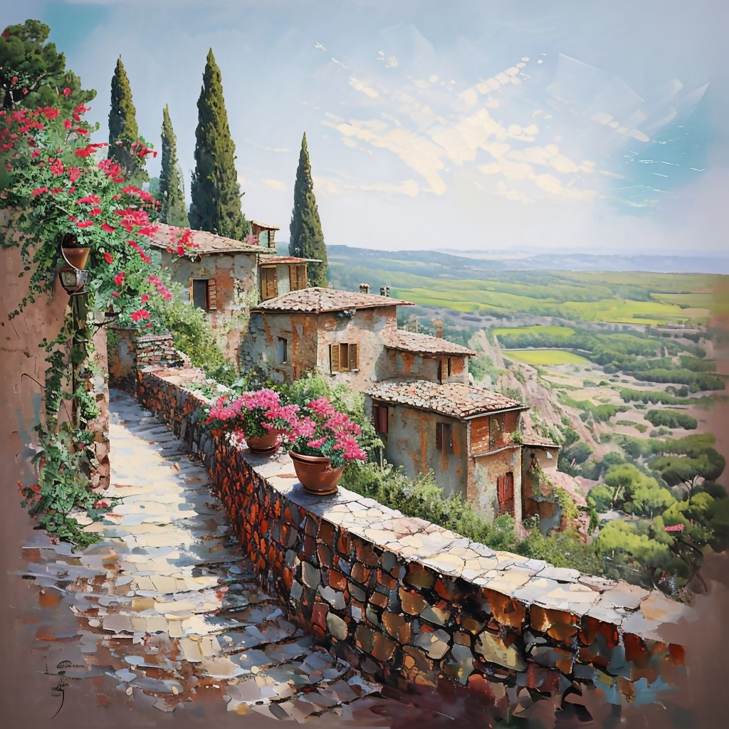 Immerse yourself in the breathtaking beauty of Italy with this captivating Tuscan village landscape painting digital art. This stunning artwork vividly portrays a charming Italian countryside scene, complete with picturesque Mediterranean architecture, rolling green hills, and vibrant floral accents. Perfect for rustic home decor, European travel art, or a unique printable gift, this high-quality instant download wall art brings the idyllic charm of Tuscany directly into your home.