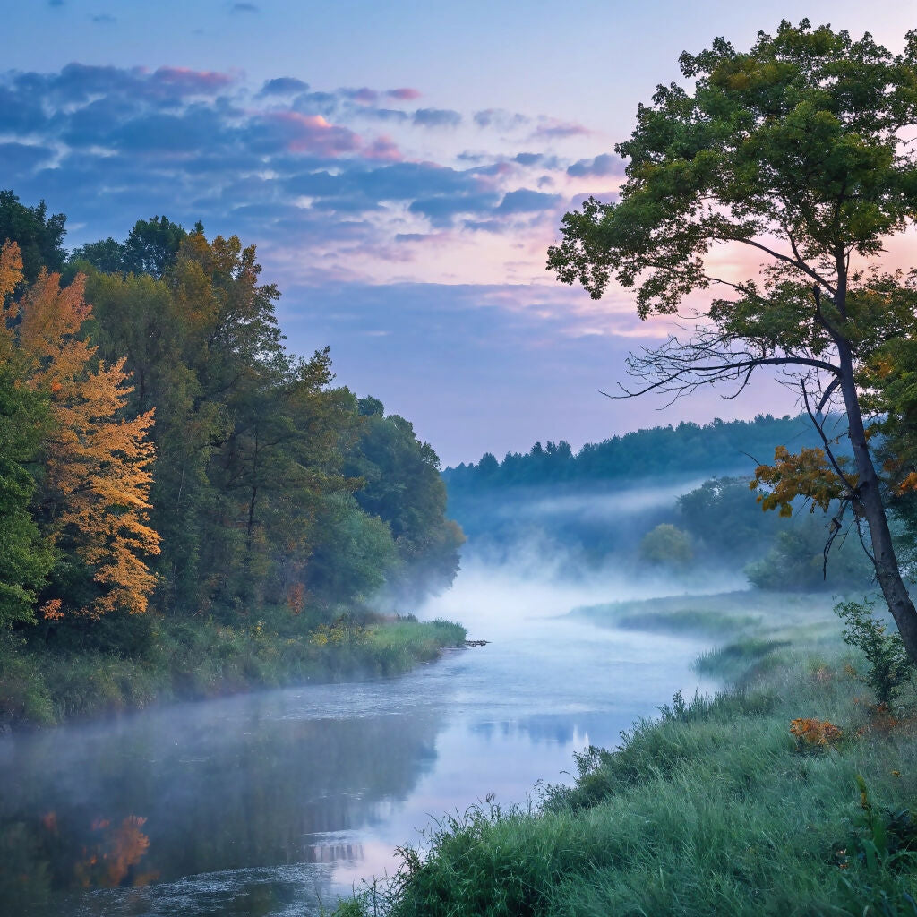 A tranquil river scene at dawn or dusk. A calm river winds through a landscape of dense deciduous forests. The river is a light bluish-gray color, reflecting the soft light of the sky. Patches of mist or fog cling to the riverbanks and valley, creating a hazy atmosphere.