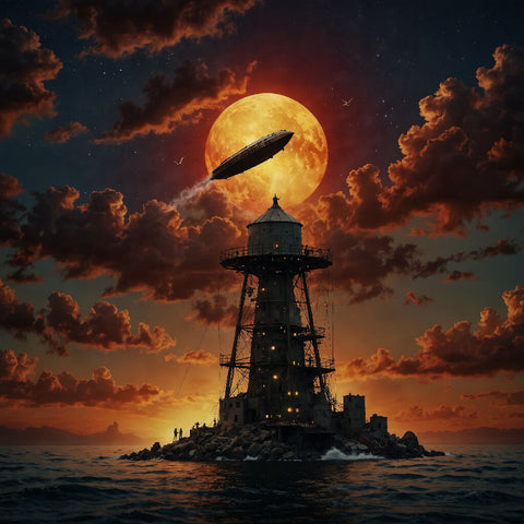 Embark on a journey of wonder with “Twilight Lighthouse Flight,” a digital masterpiece that seamlessly blends ancient mystique with futuristic allure. Picture an old lighthouse, its timeworn stones standing tall against the crashing waves. As the sun sets, an oversized moon emerges, casting an otherworldly glow. But wait—there’s more! A sleek dirigible glides across the sky, its silhouette etched against the celestial canvas. This artwork celebrates human curiosity, resilience, and our timeless fascination with exploration.