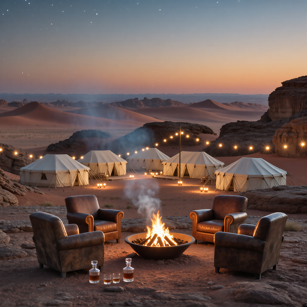 A stunning portrayal of high-end desert living. The image captures illuminated canvas tents encircling a modern fire pit, complemented by leather armchairs and whiskey glasses—ideal for illustrating luxury travel, editorial spreads, or digital decor.