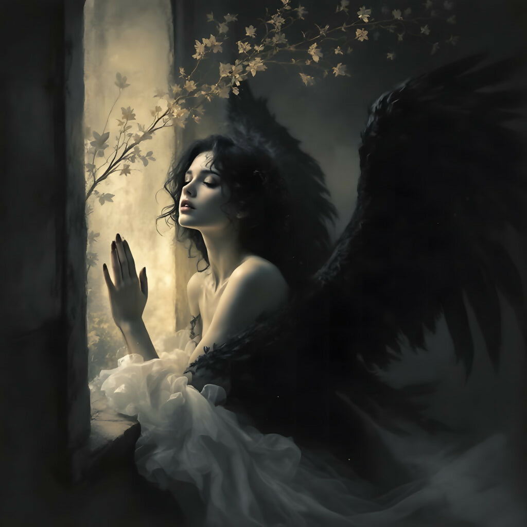 By the light of a fading world, she prays—an angel wrapped in silence and shadows. Her black wings envelop her like a mourning cloak, yet her face glows with longing and peace. A soft golden branch curves toward her from the window, as if heaven itself leans in to listen.