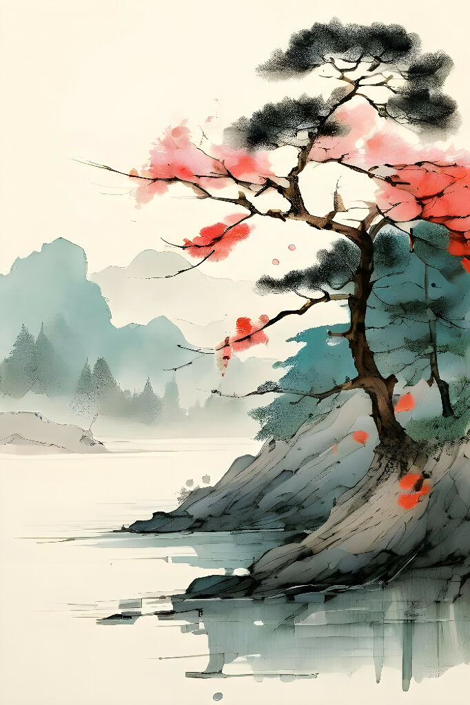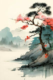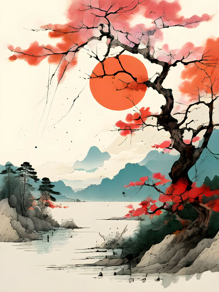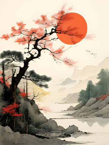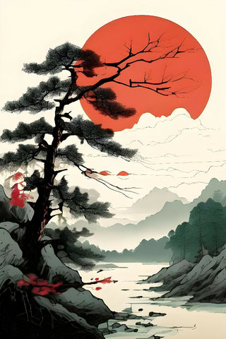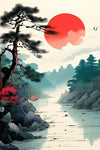 This captivating dreamscape features a fiery red sun sinking below a calm river. The vibrant colors evoke a sense of mystery and contemplation, perfect for inspiring a peaceful mood.