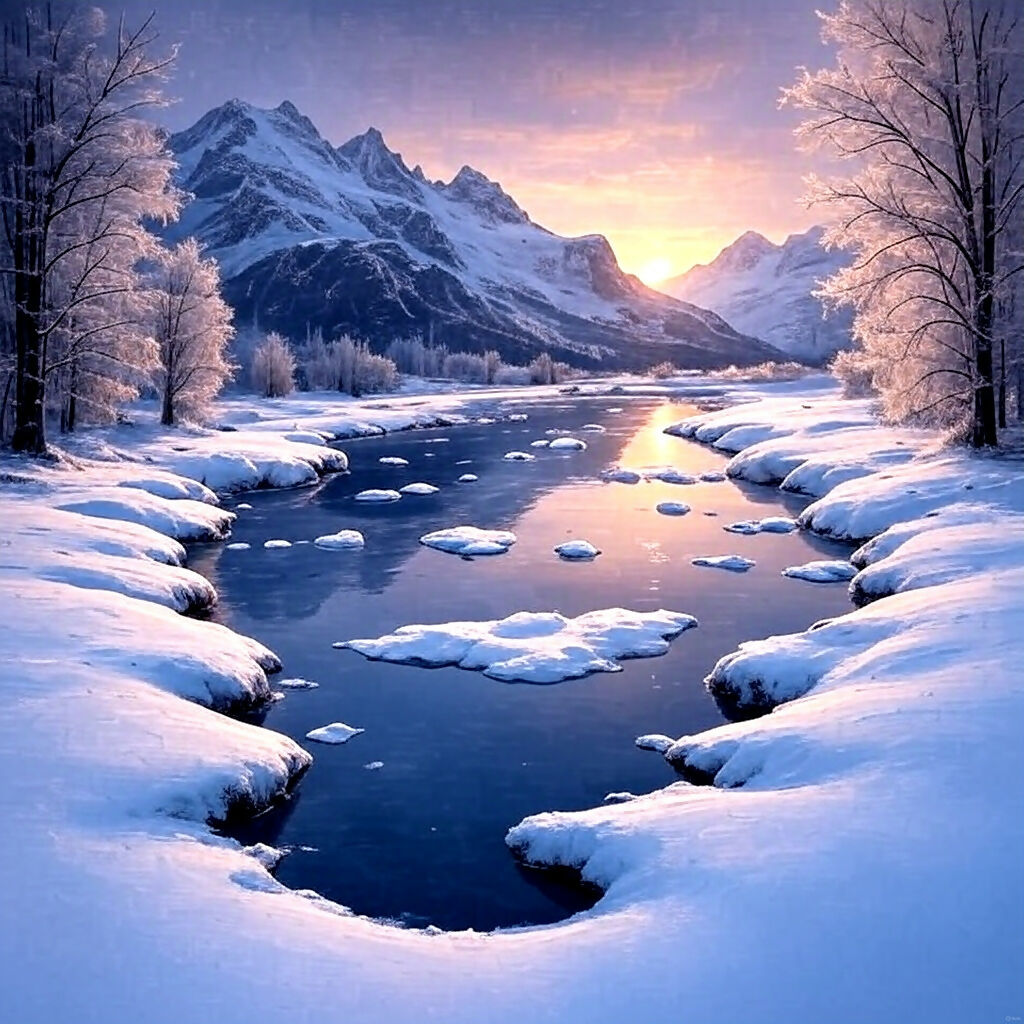 This AI-generated illustration captures the tranquil beauty of a winter river winding through snow-covered banks and frosted trees. Majestic mountains rise in the distance beneath a vibrant sky painted in hues of purple, orange, and pink, reflecting softly on the icy water. The contrast between the cold landscape and the warm glow of sunrise or sunset creates a peaceful, dreamlike atmosphere that invites quiet reflection and awe.