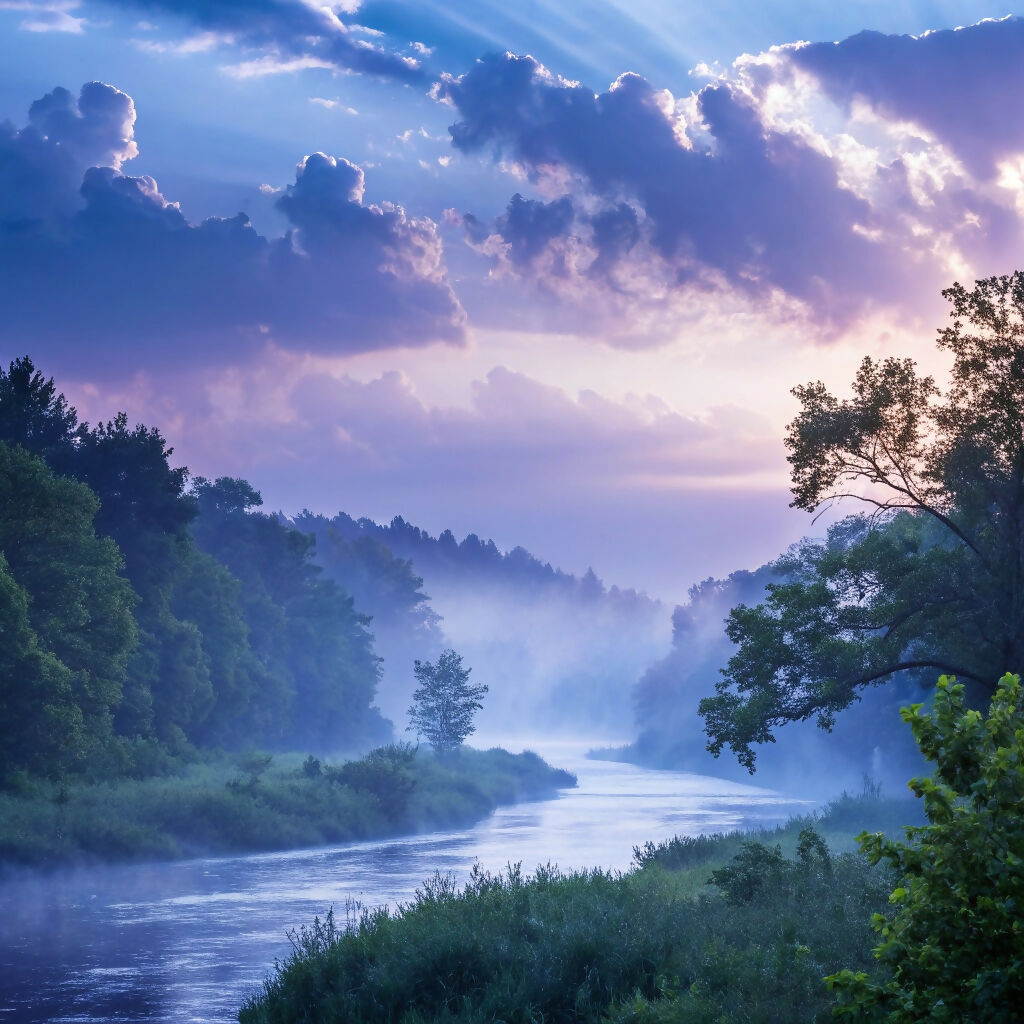 A tranquil river winds through a valley shrouded in a soft, pastel-coloured mist. Lush green forests line both banks, with trees of varying heights and shades of green. The light filtering through the clouds and mist casts a dreamlike, ethereal quality on the scene.