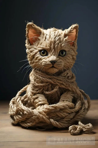 This unique artwork features a kitten composed entirely of woven rope, displaying a remarkable blend of texture and form. The intricacies of the rope create a lifelike depiction of the kitten, with each twist and knot contributing to the overall realism. The warm tones of the rope against the dark background enhance the three-dimensional effect, making it a captivating piece.