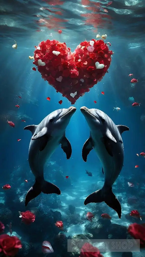 Create a heartwarming scene where two beautiful dolphins carry valentine shaped hearts in their mouths in a deep blue romantic underwater setting surrounded by red valentine hearts, yellow flowers, and romantic mermaids, cinematic dramatic lighting, photo realistic, high resolution, in the style of David Doubilet; Brian Skerry