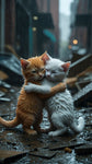 "Two drenched kittens, one orange and one white, hugging each other tightly amidst a rainy, debris-filled urban alley, their soaked fur clinging to their small bodies, eyes full of sadness and comfort, capturing a moment of deep emotion, survival, and companionship in a cinematic, post-storm atmosphere."