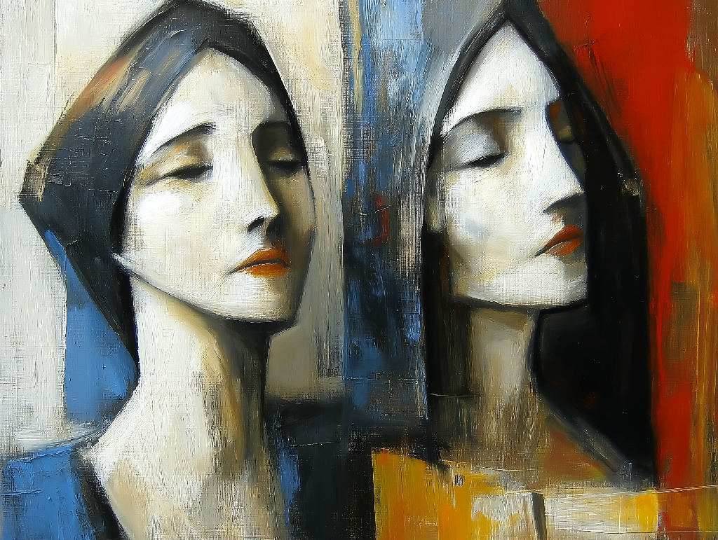 Composition: The figures are positioned closely together, creating a sense of unity or perhaps a visual reflection. The stark division of the background colors (blue on one side, red-orange on the other) enhances the central focus on the women and adds a symbolic element to the artwork. The strong vertical lines created by the figures and the background are countered by the soft curves of the women's necks and shoulders.