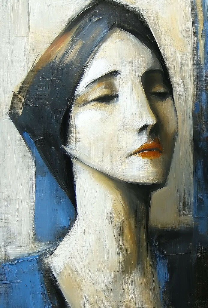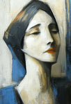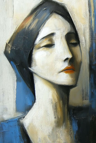 This image appears to be a semi-abstract painting that focuses on a figure, rendered with bold and expressive brushstrokes. The figure is draped in a deep blue garment or hood, which creates dynamic contrast against the lighter background tones. The brushwork emphasizes texture, with thick strokes that add depth and movement to the piece. The composition is stark and minimalist, drawing attention to the interplay of light and shadow on the figure's neck and shoulders. The palette is dominated by muted blues, whites, and beige tones, evoking a somber yet serene mood. The abstract style lends the image a contemplative and emotional quality, leaving much to the viewer’s interpretation.