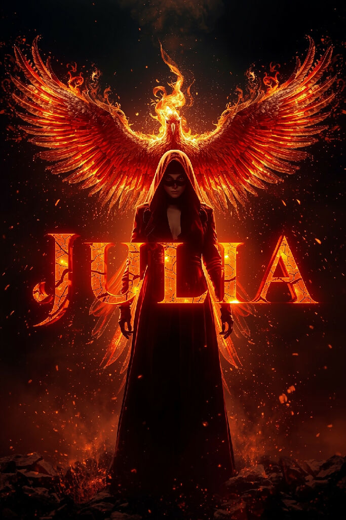 Ultra realistic 8K black wallpaper, massive cracked 3D JULIA text glowing in fiery orange and red LED. Hooded woman, long flowing coat, mask, aura glowing fiery red. Behind her a full-body phoenix, wings spread, feathers blazing with divine fire energy. Sparks, smoke, cinematic lighting, divine and majestic.