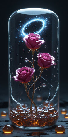 Ultra-realistic 8K resolution, Octane render, Unreal Engine 5 masterpiece, dark academia aesthetic, enchanted glass terrarium containing: two hybrid heliotrope-roses with translucent ruby gemstone petals (vitreous refraction), metallic obsidian stems (bioluminescent vascular system), liquid mercury dewdrops suspended mid-fall, spiral cerulean nebula core emitting plasma tendrils, fractured amber glass veins pulsing with trapped starlight, quantum foam escaping through dimensional cracks, non-Euclidean spacetime geometry, vantablack void background with gravitational lensing distortion, chrono-crystalline lattice framework, volumetric photon mapping event horizon glow, subsurface scattering in petal nanostructures, temporal anomaly causing timeline overlaps, hyperdetailed microbiology under gemstone epidermis, gothic biodigitalpunk style blending Zdzisław Beksiński and Ernst Haeckel, photorealistic macro photography meets celestial cartography, trending on ArtStation --ar 16:9 --v 6.0 --no cartoonish, flat colors, symmetry, human elements