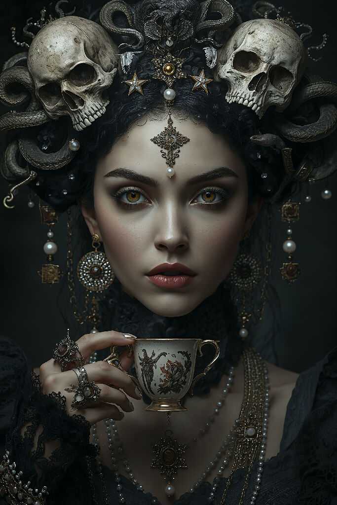 Ultra realistic dark surreal female portrait, hyperdetailed face, elegant gothic fantasy aesthetic, cinematic chiaroscuro lighting, oil painting style, ornate and mystical accessories (skull, stars, snakes, pearls, ancient jewelry, steam tea cup), ethereal and melancholic atmosphere, baroque and renaissance influence, dramatic expression, haunting beauty, magical symbolism, masterpiece, 8K, photorealistic, trending on ArtStation, moody soft background