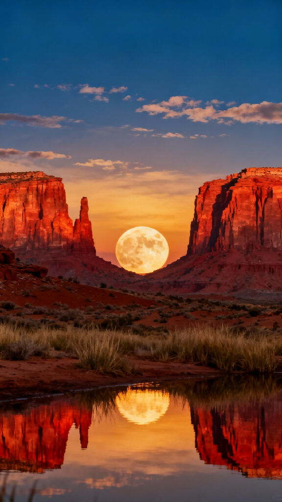 Ultra-realistic landscape photograph of Monument Valley Navajo Tribal Park at dusk, featuring iconic red sandstone buttes and mesas illuminated by warm sunset light. A large supermoon rises low between the towering rock formations, perfectly centered on the horizon, appearing natural in scale and color. The sky transitions from deep blue to warm amber with scattered thin clouds. In the foreground, calm water reflects the glowing moon and crimson mesas with mirror-like clarity. Natural desert grasses and subtle terrain textures add depth. True-to-life geology, realistic moon size, soft atmospheric haze, National Geographic style, cinematic but natural lighting, ultra-sharp focus, 8K photorealism, no CGI.
