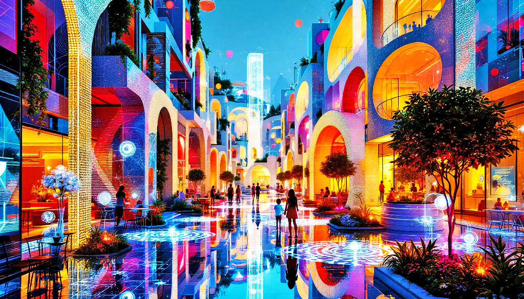 L'atmosphère est à la fois futuriste et accueillante. Les couleurs vives, les lumières scintillantes et les formes architecturales audacieuses créent une ambiance énergique et dynamique. La présence de personnes et de végétation adoucit l'ensemble, suggérant un espace urbain vivant et agréable à vivre. L'humeur est optimiste et pleine d'espoir, évoquant un futur radieux et harmonieux.