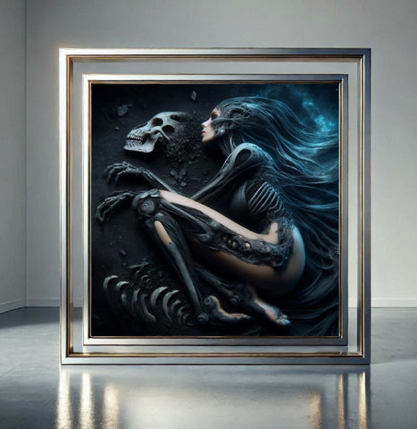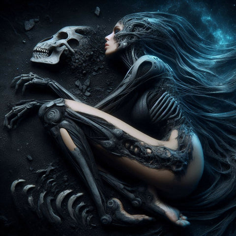 In den Tiefen einer dunklen, unergründlichen Welt liegt eine Gestalt von unwirklicher Schönheit. Ihre Haut, ein Geflecht aus Metall und organischem Material, zeigt ein faszinierendes Spiel aus Maschine und Mensch. Lange, dunkle Haare umhüllen sie wie ein Schleier, der die Grenzen zwischen Realität und Traum verschwimmen lässt. Die Szene ist ein stiller Dialog zwischen Vergänglichkeit und dem Streben nach Unsterblichkeit, eine melancholische Betrachtung der menschlichen Existenz in einer postapokalyptischen Welt. Die Mischung aus zerbrechlicher Schönheit und mechanischer Härte erzeugt eine einzigartige Atmosphäre von fragiler Stärke und geheimnisvoller Traurigkeit. Das Bild lässt Raum für Interpretationen über den Verlust, die Transformation und die Suche nach Verbindung in einer Welt, die von den Überresten der Vergangenheit geprägt ist.