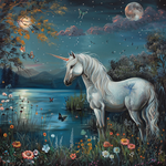 Under the Light of the Silvery Moon captures the magic of a white unicorn watching the moon over a lake.