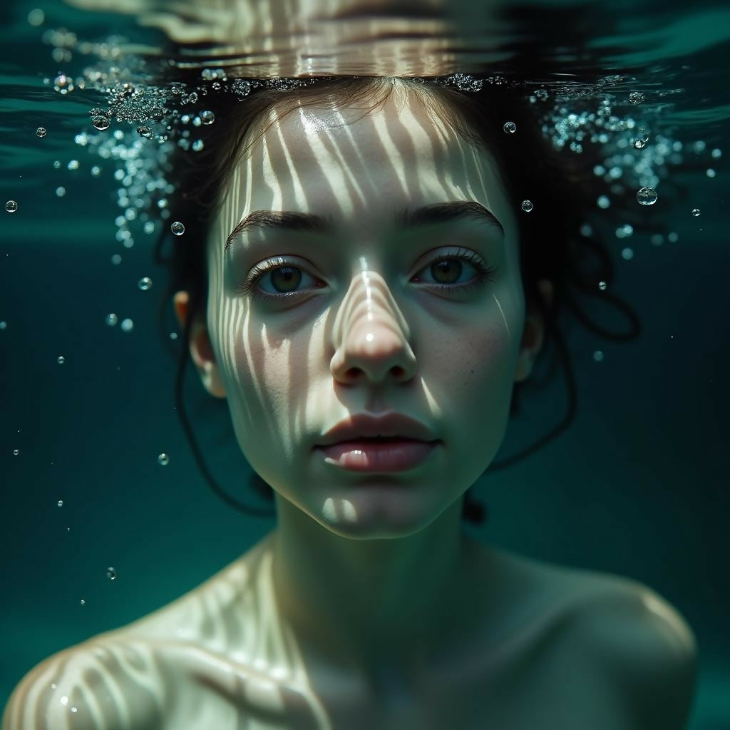 Woman under the surface of the water holding her breath, she is still and watching, realistic photo shot