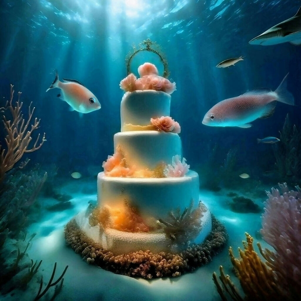 This is an ai generated color photograph of an underwater wedding cake sitting on the ocean floor, surrounded by sea creatures and bathed in dazzling sunlight.