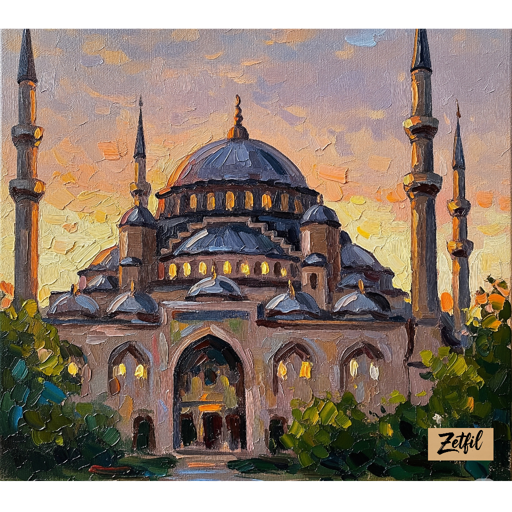 L'œuvre met en scène une architecture imposante, avec son grand dôme central et ses quatre minarets élancés, peints dans des teintes de bleu saphir et de gris ardoise. Les détails des motifs architecturaux sont subtilement mis en valeur par la lumière douce et chaleureuse qui se dégage des fenêtres.