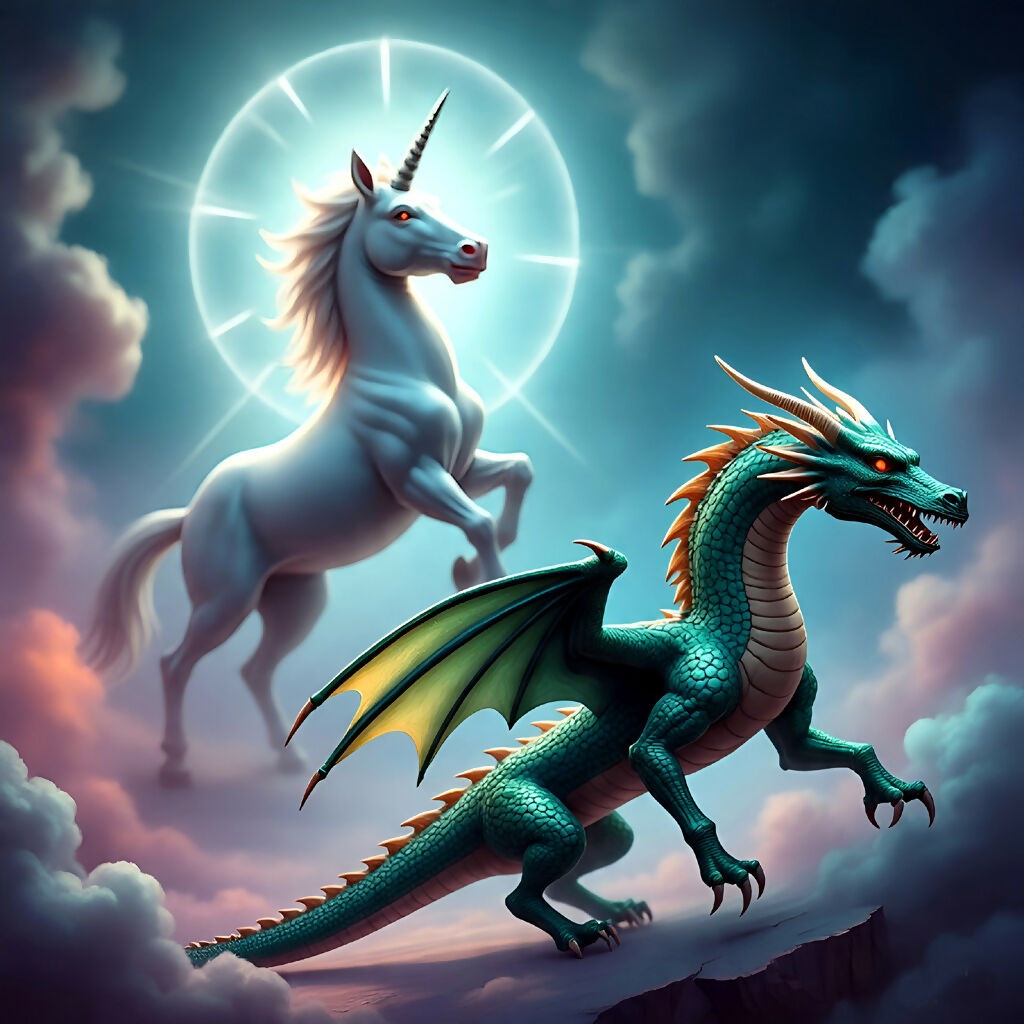Step into a realm where legends collide. This surreal AI-generated artwork captures a dramatic standoff between a luminous unicorn and a formidable dragon, set against a celestial backdrop of swirling clouds and radiant light. The unicorn, symbol of purity and magic, rises defiantly as the dragon, embodiment of power and chaos, watches from a jagged cliff. Their silent confrontation evokes themes of balance, destiny, and the eternal dance between light and shadow. Ideal for fantasy lovers, surreal art collectors, and dreamscape enthusiasts.