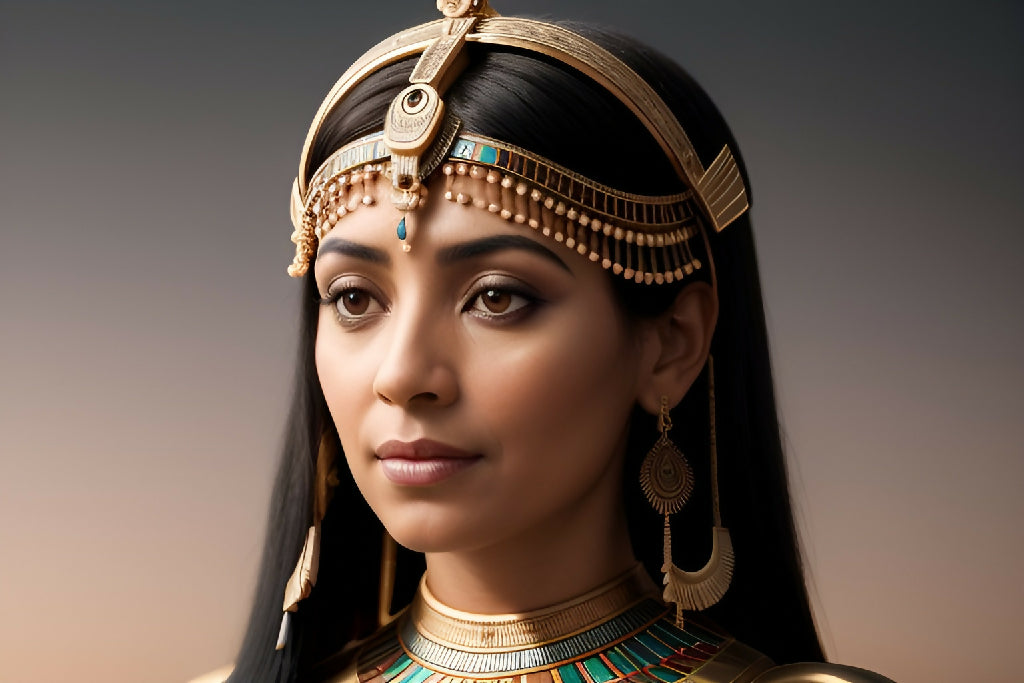 A woman is dressed in a striking gold and blue garment, showcasing her unique fashion sense. The image captures her face, emphasizing her style and the allure of the outfit. The background consists of a simple wall, which highlights the colors and textures of her attire.