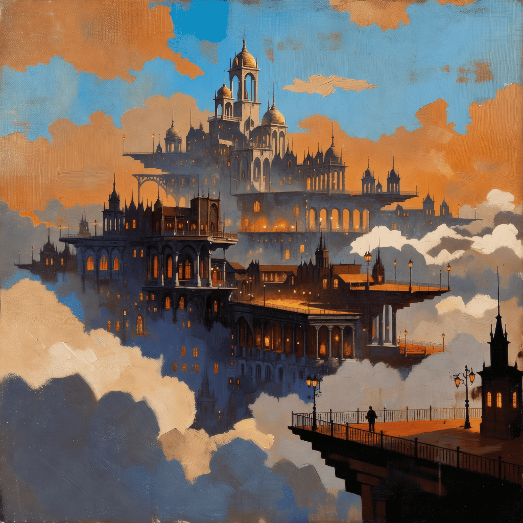 Dive into the dreamlike universe of "Urban Dreams #2: floating city in the clouds", an AI-generated surrealist artwork that reimagines the city as a floating utopia. Multi-tiered ancient palaces and domed towers suspended amidst swirling clouds, illuminated windows glowing warmly at dusk, narrow bridges connecting ethereal platforms with solitary figures, all bathed in warm orange and blue tones with dramatic sunset hues. Textured canvas background, cinematic lighting casting mystical glows, hyper-detailed in 4K resolution. Created by artist Lumenforge, this piece evokes emotions of wonder, solitude, and escape, blending historic architecture with impossible dreamscapes. Perfect for adding a sense of boundless imagination and serene mystery to your space.
