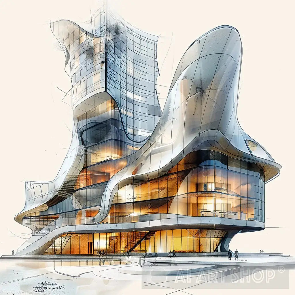 Wave-like forms and transparent glass surfaces that allow light to play across the structure. The emotion is one of sophistication and modernity, capturing the essence of contemporary urban life.