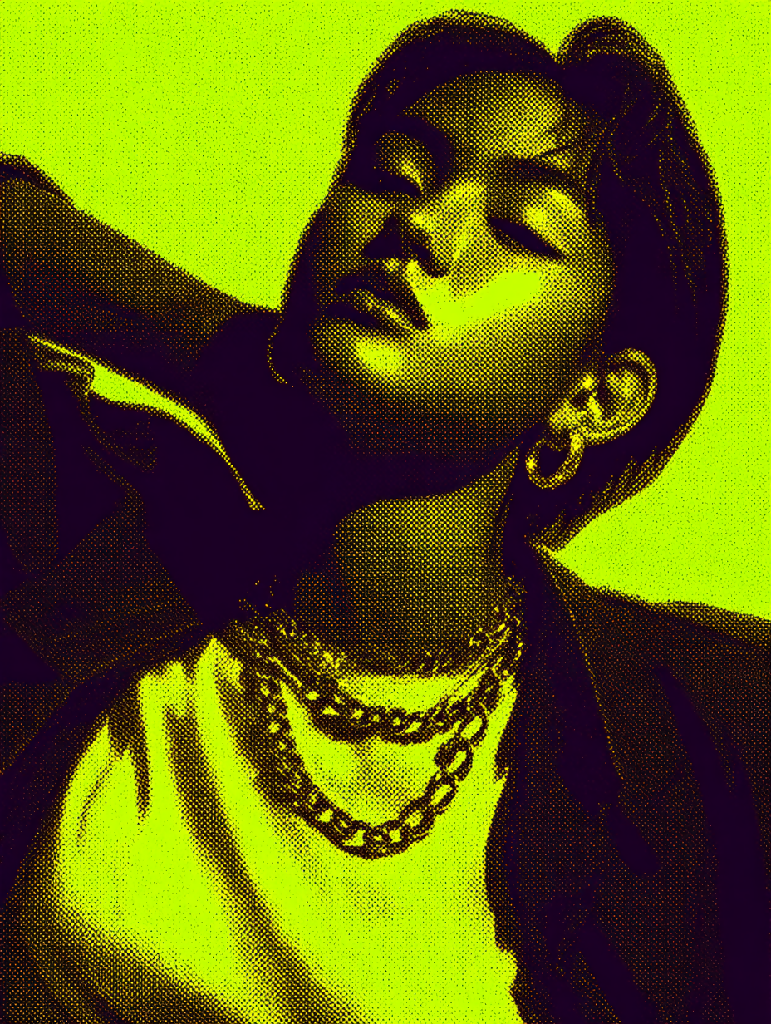 Channeling attitude, elegance, and futuristic fashion, Urban Glare: Alexigerinumpunk Pulse stands out with bold halftone textures and a piercing neon yellow palette. This Pop AI Art piece embodies the modern urban spirit—confident, unbothered, and unapologetically stylish. The chain accessories and angular pose give the artwork a magnetic, fashion-editorial energy, while the AI-enhanced retro style nods to underground street zines and digital rebellion.