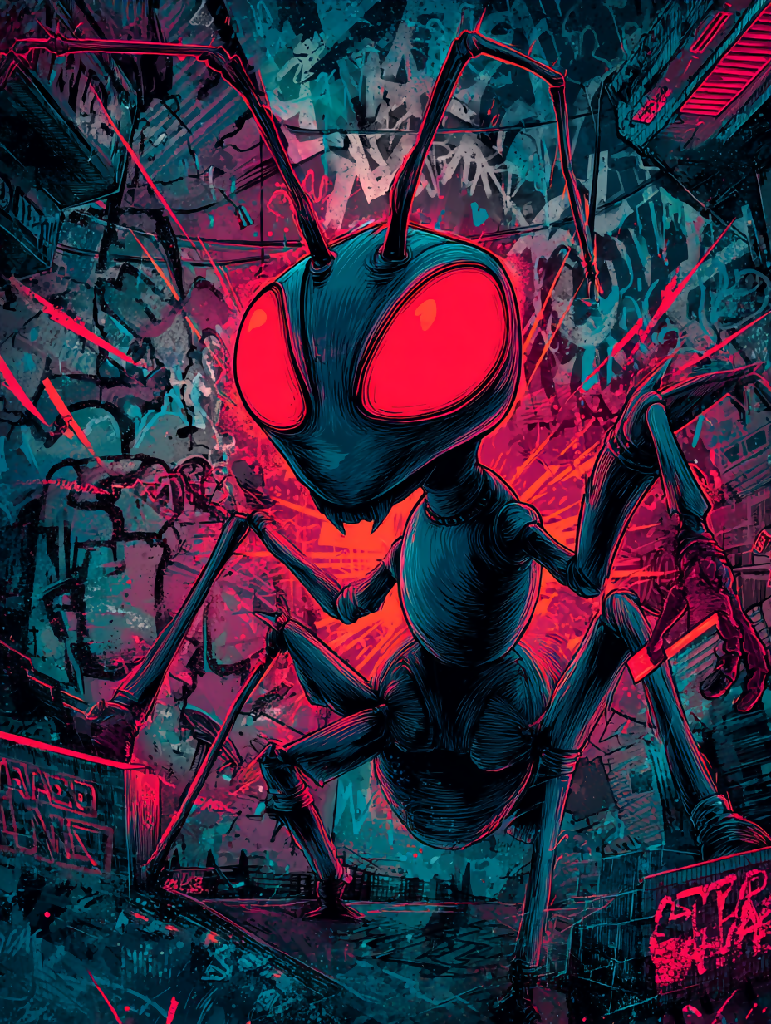 Tags: urban mutation, giant insect, red eyes, graffiti art, dystopian city, surreal horror, street chaos, sci-fi creature, post-human landscape, visual overload