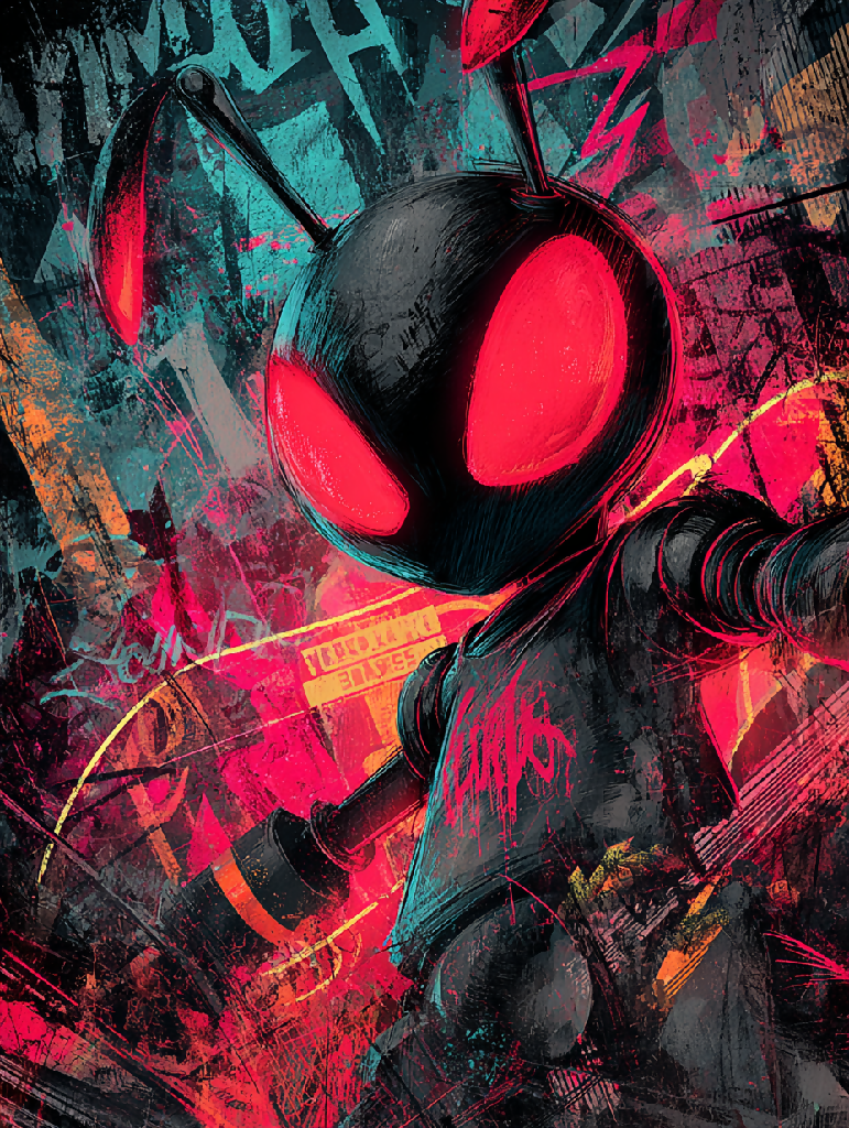 Tags: urban mutation, signal transmission, red eyes, graffiti chaos, insectoid figure, dystopian city, surreal vigilante, vibrant colors, post-human aesthetic, antenna creature
