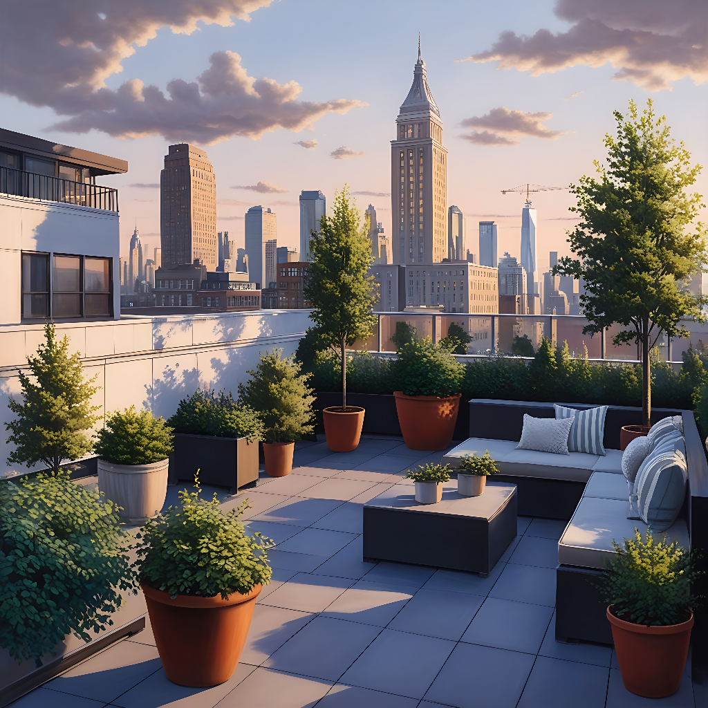 Lush rooftop garden with potted plants, city skyline at sunset