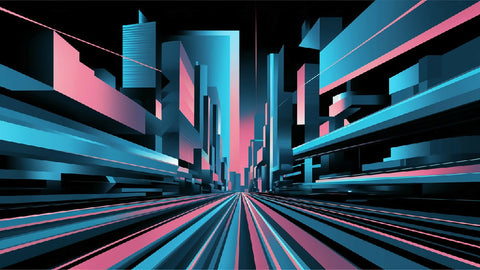Abstract cityscape at twilight, with bold geometric shapes and vibrant neon colors. Include dynamic, overlapping patterns to represent urban energy and movement. Use a mix of blues, pinks, and metallic against dark backgrounds. Emphasize light and shadow for depth and vibrancy.”