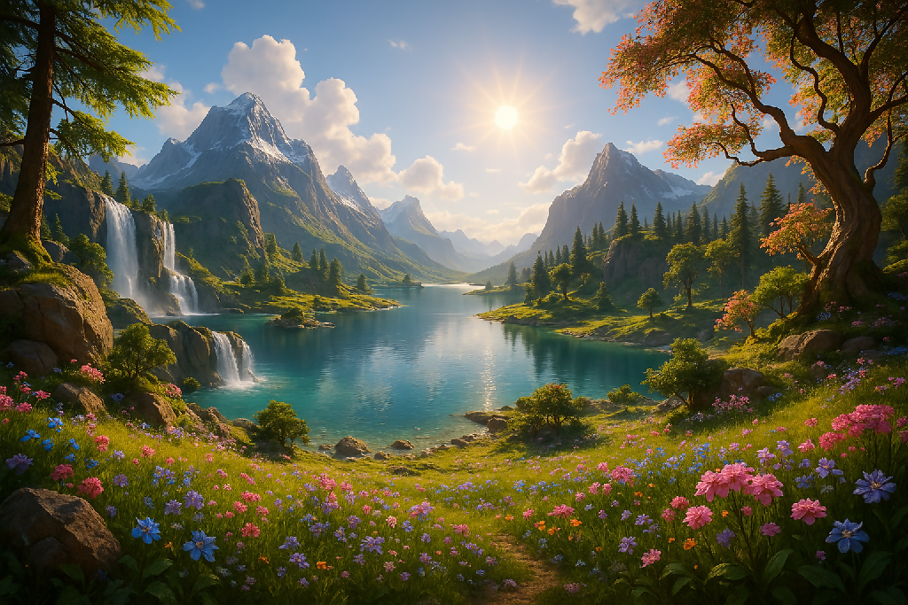 Hidden beyond the known lands lies the Valley of Eternal Bloom, a magical realm untouched by time. Here, every sunrise is a golden promise, and the flowers never fade. The mountains stand like ancient guardians watching over a crystal lake that whispers forgotten tales. Travelers who find this place speak of its healing silence and a beauty so perfect, it feels like a dream that never ends.