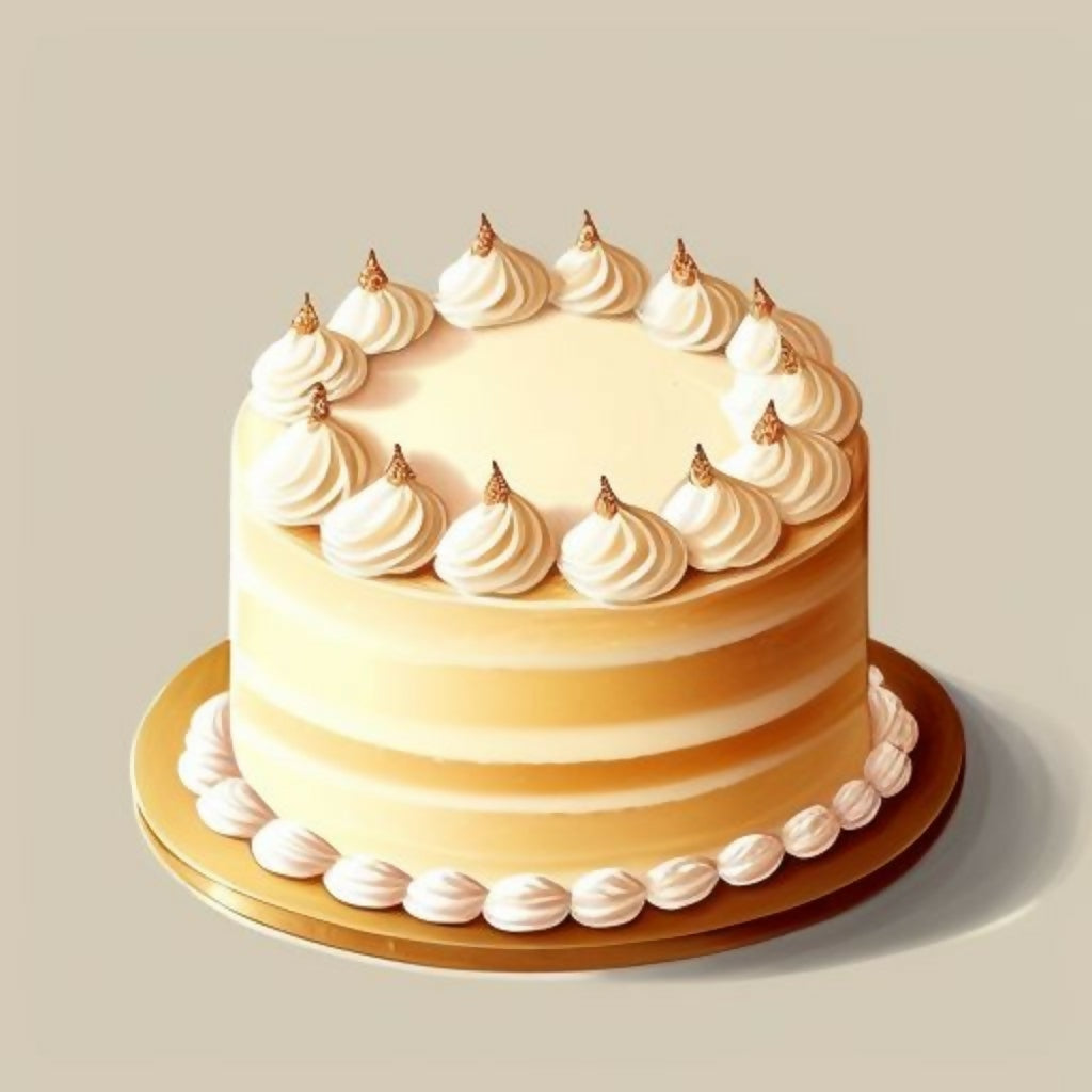 An illustration of a delicious-looking vanilla cake. Grey background.