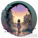 This art piece will take you on a journey through time and space, igniting your imagination and curiosity. You will be captivated by the intricate details of the cosmic city inside the portal, which is brought to life with bright and bold colors. The juxtaposition of the girl on the grimy sidewalk and the futuristic city behind the portal creates an interesting contrast that will leave you fascinated.