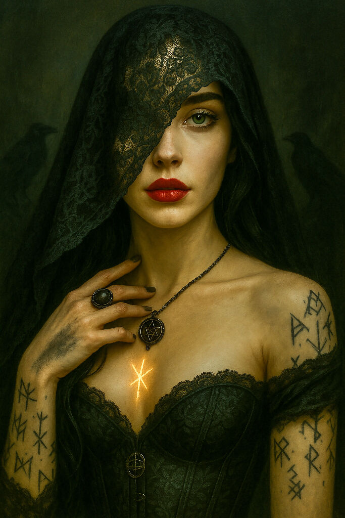 Her vibrant red lips stand in stark contrast to the darker tones of the image, while a luminous, star-like glow emanates from her chest, hinting at an inner light or magical energy. Around her neck hangs a detailed pendant, possibly a protective amulet or a symbol of her mystical affiliations. Both of her forearms are adorned with intricate runic tattoos, suggesting a connection to ancient lore or a powerful lineage. In the dimly lit background, the subtle silhouettes of two ravens add to the mystical and somewhat ominous atmosphere. This artwork is a compelling blend of dark fantasy and enigmatic beauty, perfect for those drawn to themes of magic, hidden knowledge, and powerful feminine figures.