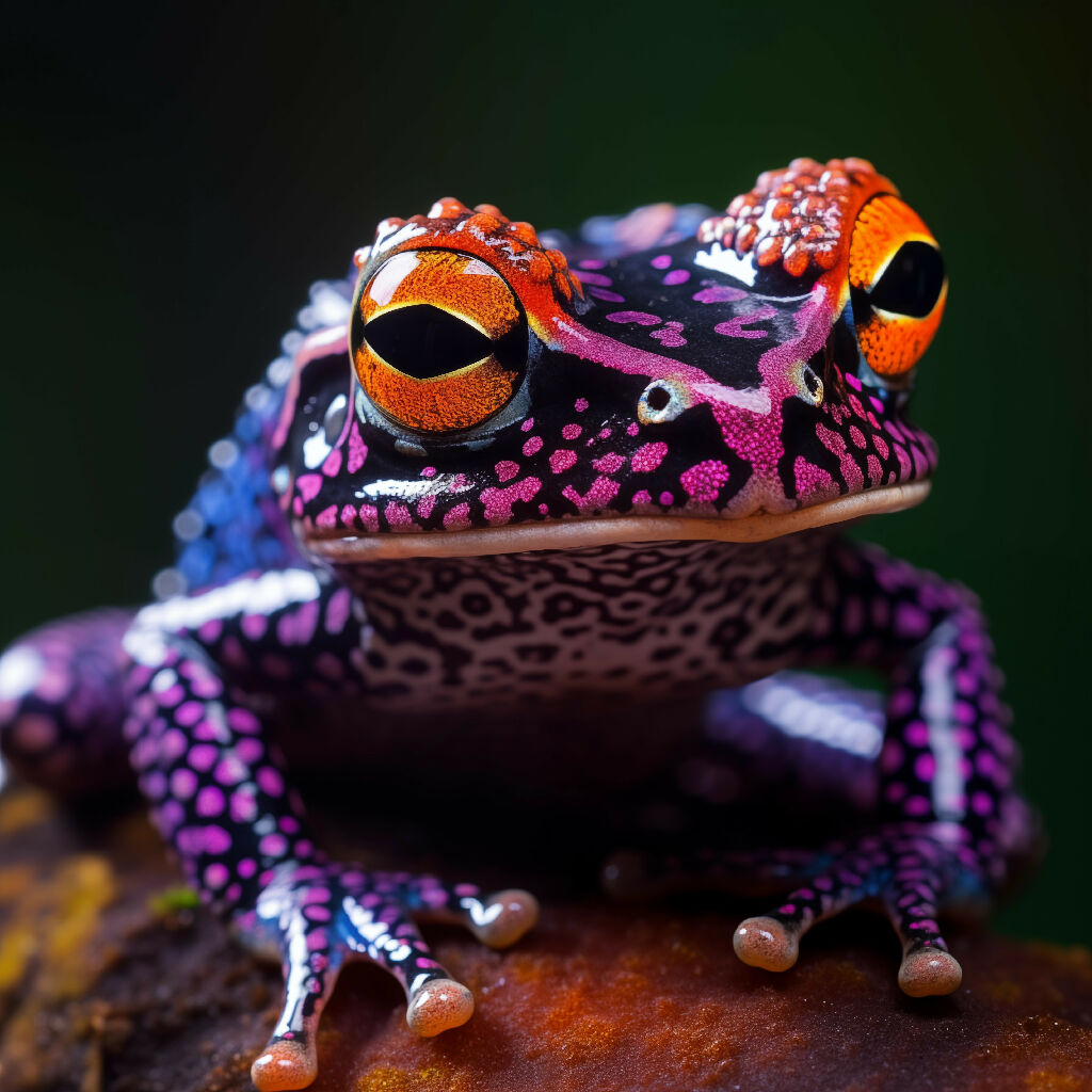 A frog’s portrait where its skin is textured like soft velvet covered in tiny iridescent mushrooms—each one bioluminescent and grown with AI-generated fungal diversity.