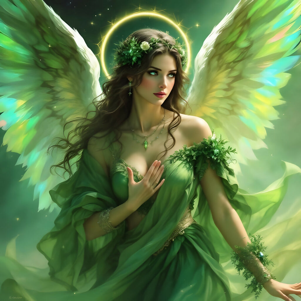 Radiating serenity and vitality, this forest angel stands cloaked in emerald robes and adorned with leaves, vines, and glowing green jewels. Her luminous wings shimmer with hints of gold and aqua, and a golden halo crowns her flowing brunette hair.