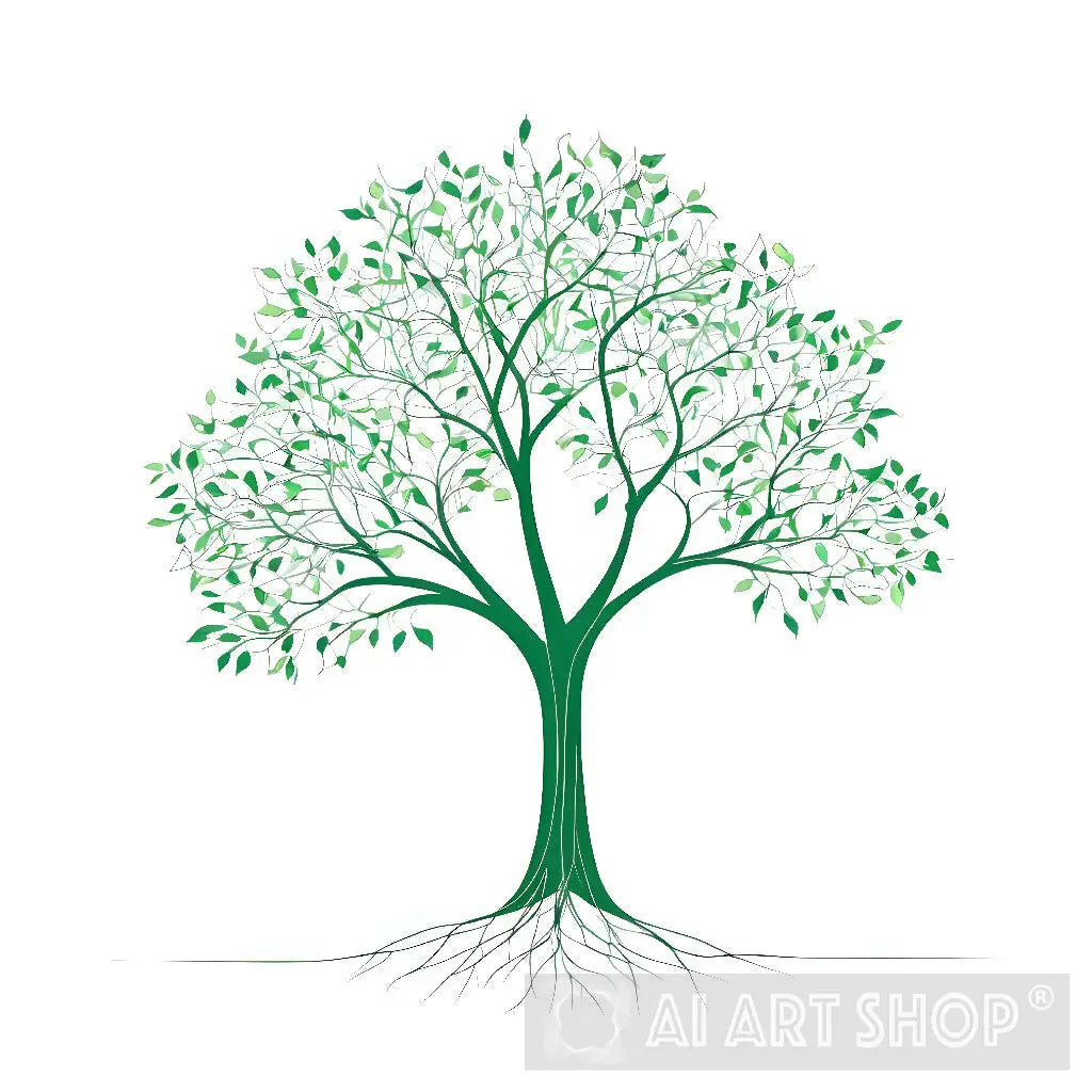 - This striking digital artwork depicts a tree with a vibrant green canopy and roots against a clean white background. The artist has captured the intricate details of the leaves and roots, creating a textural and visually interesting piece.
