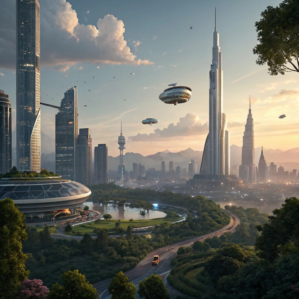 The cityscape is composed of towering, sleek skyscrapers of varying heights and designs. The architectural style is modern and futuristic, with a blend of glass, metal, and potentially other advanced materials. Several flying vehicles, resembling large, saucer-shaped craft, are visible in the air, suspended above the buildings.